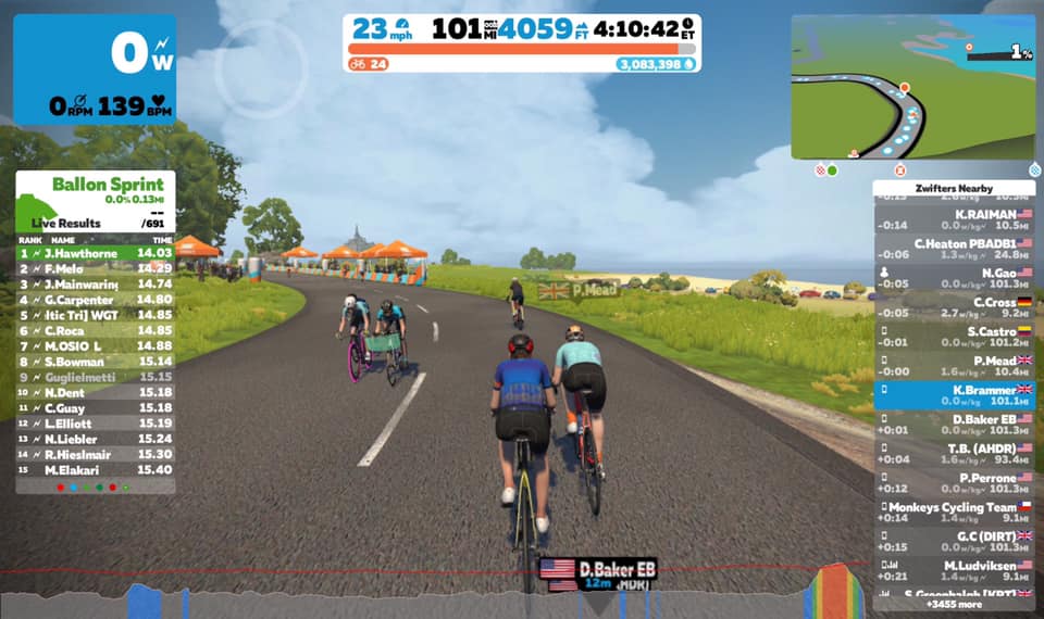 Saturday’s Challenge, 101 miles in 4 hours 10 minutes on the beautiful French course on Zwift.