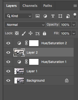 The first thing I do when dealing with an image especially 2 images that have been merged together as these have and they are originally black and white is to match the black and white tones giving a uniform tone throughout the merged image. This is done simply by adding an adjustment layer to each layer using the Hue/Saturation option. All you simply do is just take the saturation option and drag the slider to -100 on both layers and you will then have a perfect black and white toned photo.