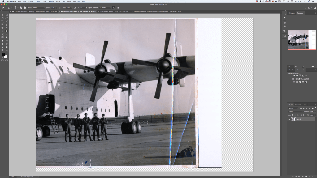 I start the restoration process by scanning the damaged original photograph using a high resolution scanner. I usually save the image in a TIFF format which means that it creates a much bigger digital image, it allows multiple layers as well to be saved within one image, which is perfect for how I do restoration work using either Photoshop or Affinity Photo software on my iMac. It also means that I increase the image size on my monitor without losing any quality or creating pixelation.